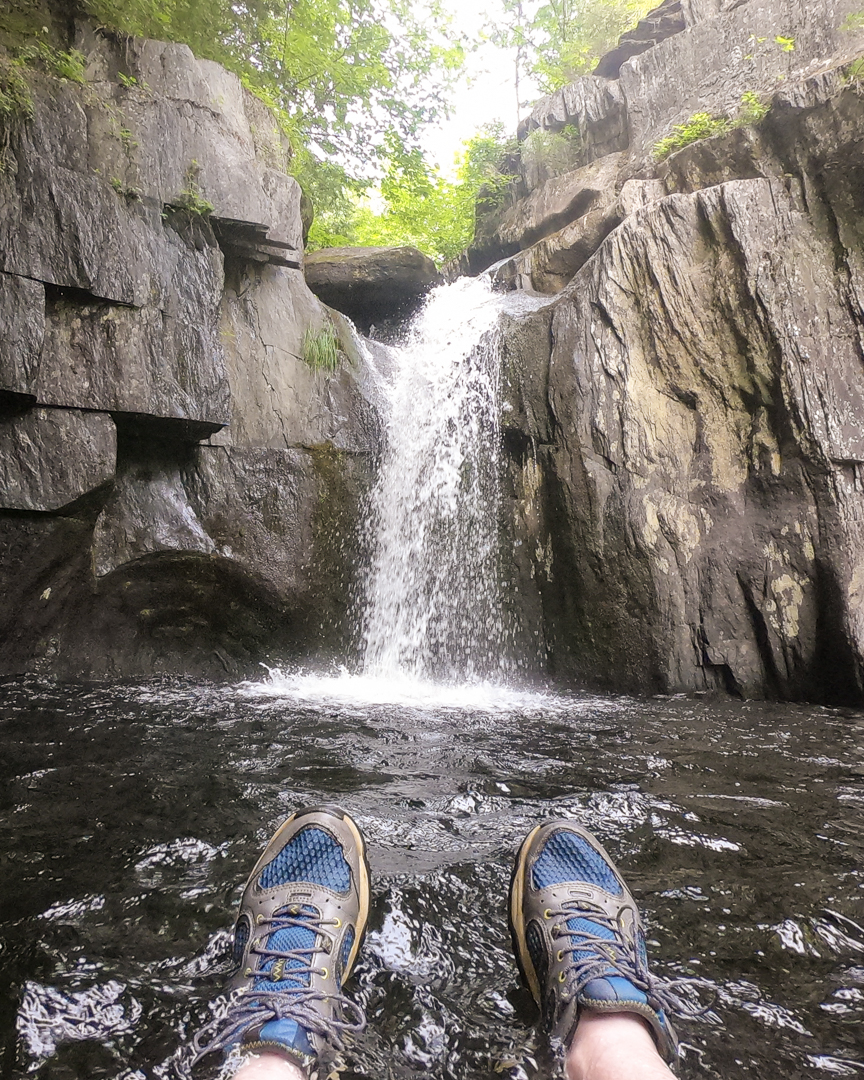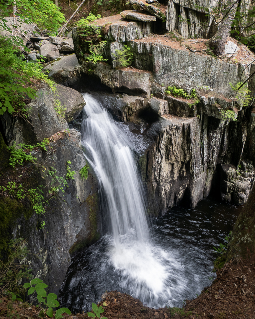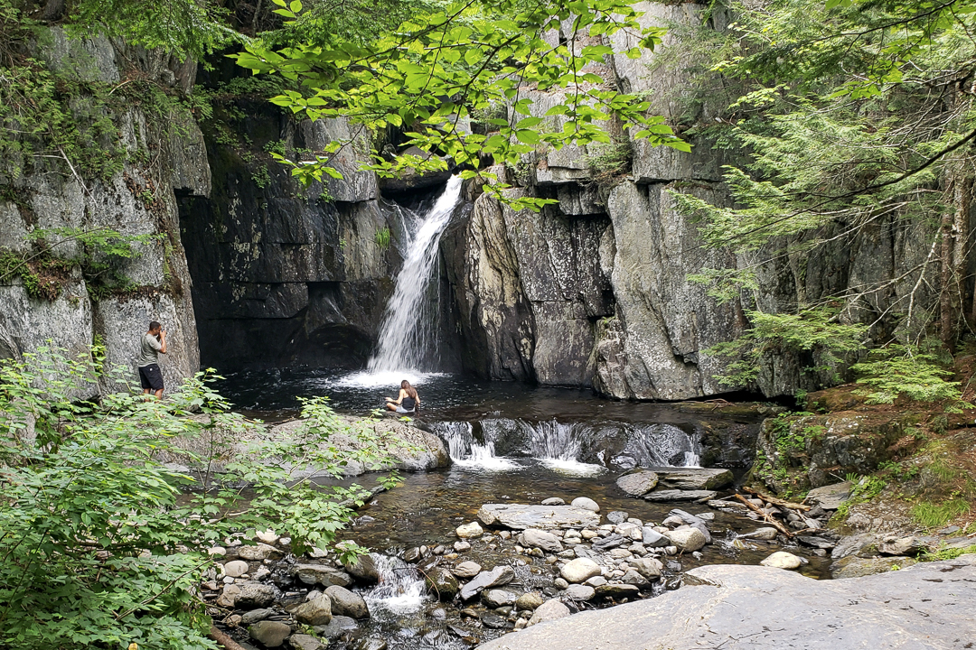 The first 2 miles are uneventful, but easy, and after about 45 minutes to an hour, you’ll reach the first set of waterfalls, Stair Falls, where Bear Brook converges with the Pleasant River.