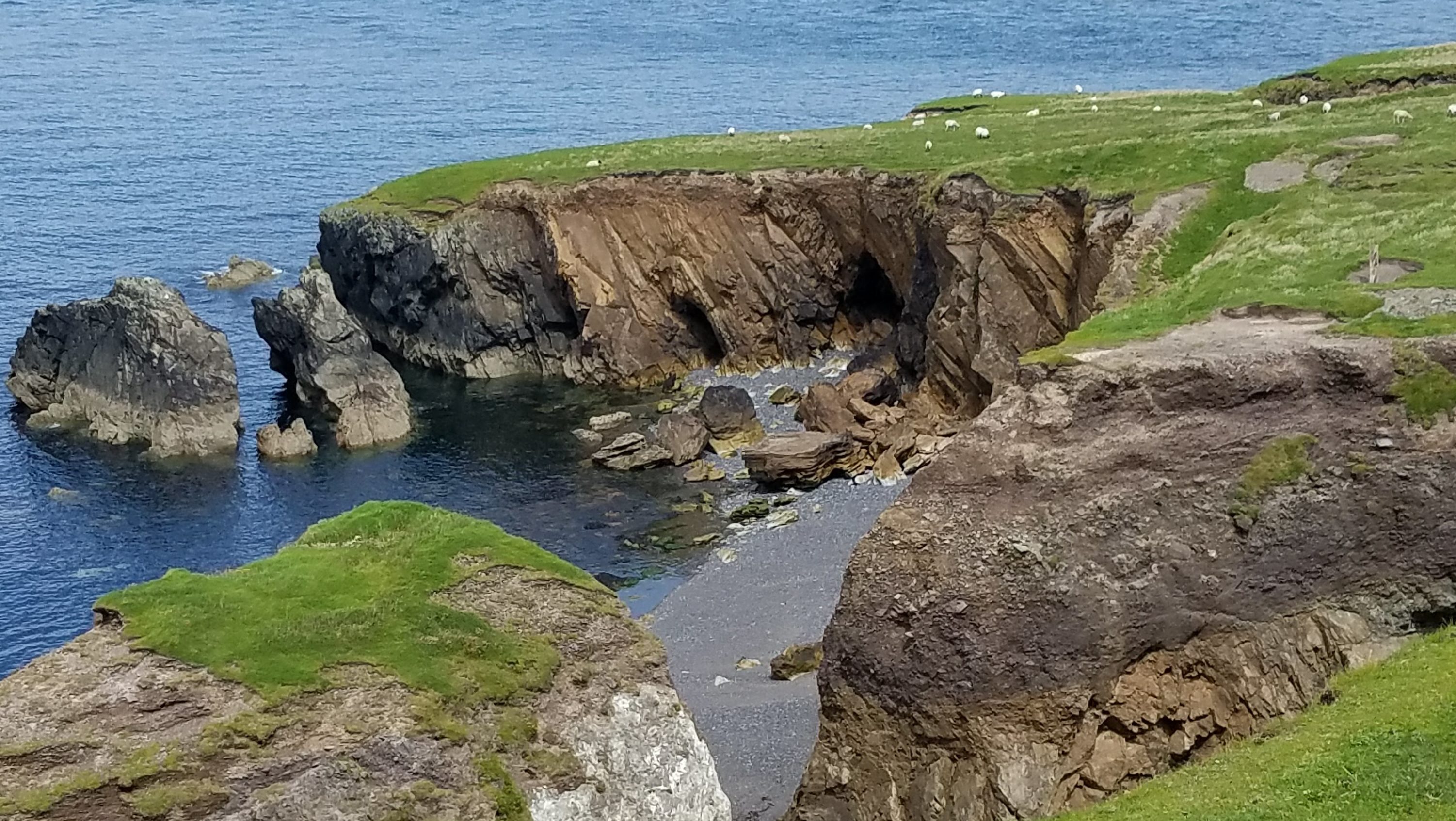 Next, we crossed the bridge to get back on the Ring of Kerry at Cahersiveen, a nice town with a busy downtown with a bunch of pubs and restaurants. We took the quick car ferry to Valentia Island and drove up to Geokaun Mountain & Cliffs, where we enjoyed the views of the cliffs and Skellig islands from high above until a sudden down pour with high winds sent us running back to our car! At Geokaun there are several loops to walk on or you can just drive to the scenic overlooks.